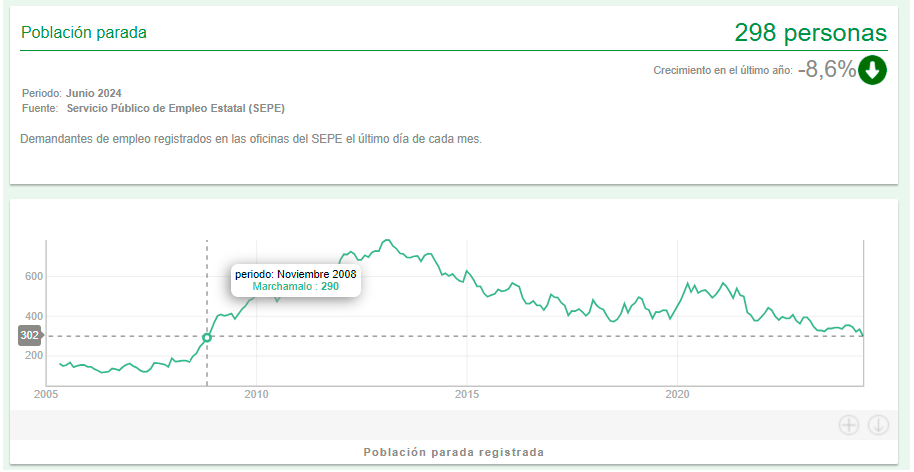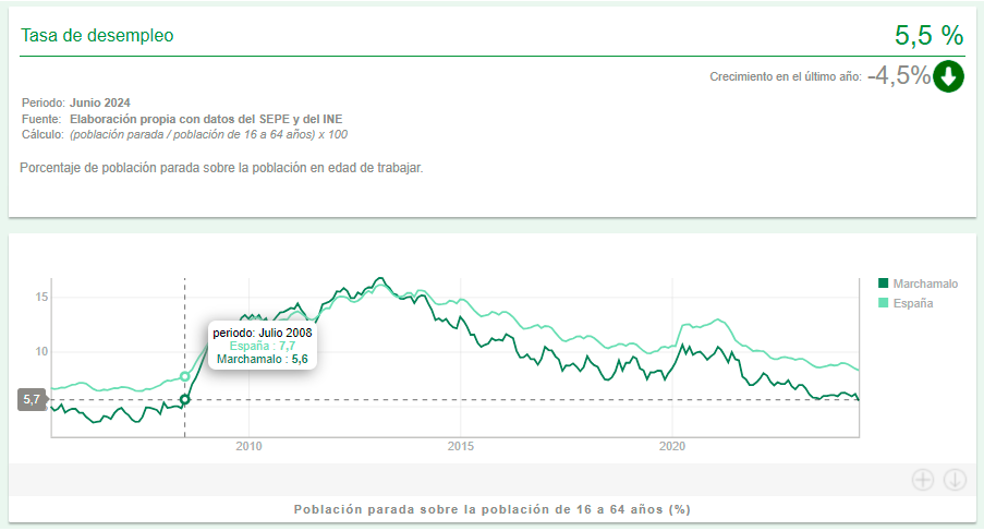 Marchamalo es ya el municipio mayor de 5.000 habitantes con la tasa de desempleo más baja de toda la provincia de Guadalajara. En el mes de junio el desempleo volvió a bajar en nuestro municipio hasta el 5,5 % de nuestra población activa, esto es, los habitantes en edad de trabajar (entre 16 y 64 años), alcanzando por primera vez los soñados niveles previos a la enorme crisis financiera de 2008, más en concreto, de julio de 2008. Si calculamos el porcentaje de desempleados, que por primera vez en 16 años han bajado de la barrera de los 300 (298 en junio), en base a la población total, la tasa de desempleo en Marchamalo se queda en el 8,51 %, más de tres puntos por debajo de la tasa de desempleo a nivel nacional.